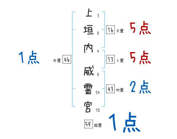 天運![]() | 上垣内威霊宮さんの天運は16画の5つ星!人望が厚く大きく発展する。逆転成功が見える。 家系が持つ宿命的な運勢を表します。祖先から受け継いだ苗字ですので自分の力が及びません。家柄を象徴します。 |