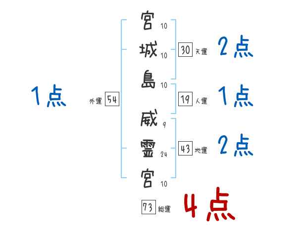 総運![]() | 宮城島威霊宮さんの総運は73画の4つ星!天徳のある人生。散財に注意すれば晩年幸福。 あなたの人生を表す1番重要な運勢です。生涯を通じて影響する総合運となり、主に50歳以降の晩年期に影響を及ぼします。 |