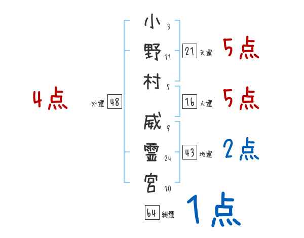 人運![]() | 小野村威霊宮さんの人運は16画の5つ星!人望が厚く大きく発展する。逆転成功が見える。 性格や才能などを表す2番目に重要な運勢です。人間関係や協調性、社会的な成功に影響します。主に20歳から50歳ぐらいまでの中年期の運勢を表します。 |