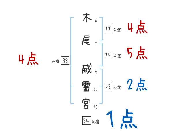 天運![]() | 木尾威霊宮さんの天運は11画の4つ星!着実に富や地位を得る幸運な人生。 家系が持つ宿命的な運勢を表します。祖先から受け継いだ苗字ですので自分の力が及びません。家柄を象徴します。 |