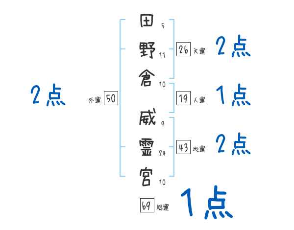総運![]() | 田野倉威霊宮さんの総運は69画の1つ星!不満を感じやすい傾向が。ストレスを貯めないように注意しましょう。 あなたの人生を表す1番重要な運勢です。生涯を通じて影響する総合運となり、主に50歳以降の晩年期に影響を及ぼします。 |