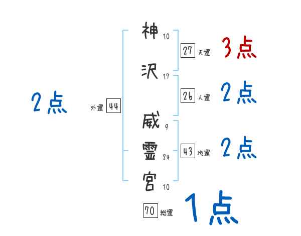 外運![]() | 神沢威霊宮さんの外運は44画の2つ星!誠実で慎重な性格。物事を考えすぎないように注意しましょう。 生活面を象徴する運勢です。外部から受ける影響力を表し、結婚運、家庭運や職場、環境への順応性を表します。 |