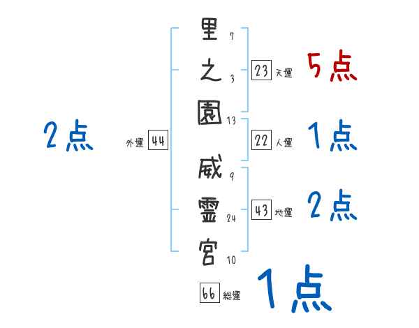 人運![]() | 里之園威霊宮さんの人運は22画の1つ星!努力することが苦手ないっぽう手先が器用。芸術性にも優れる。 性格や才能などを表す2番目に重要な運勢です。人間関係や協調性、社会的な成功に影響します。主に20歳から50歳ぐらいまでの中年期の運勢を表します。 |