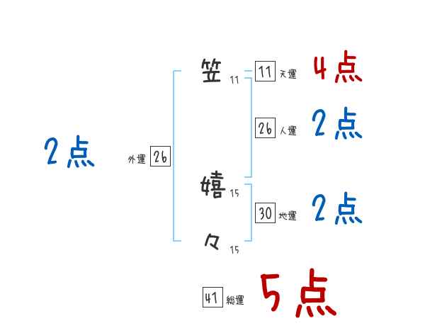 外運![]() | 笠嬉々さんの外運は26画の2つ星!波瀾万丈かも。信頼できる人を大事にしましょう。 生活面を象徴する運勢です。外部から受ける影響力を表し、結婚運、家庭運や職場、環境への順応性を表します。 |