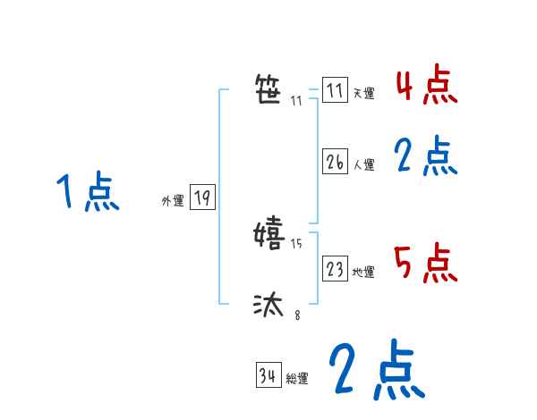 天運![]() | 笹嬉汰さんの天運は11画の4つ星!着実に富や地位を得る幸運な人生。 家系が持つ宿命的な運勢を表します。祖先から受け継いだ苗字ですので自分の力が及びません。家柄を象徴します。 |