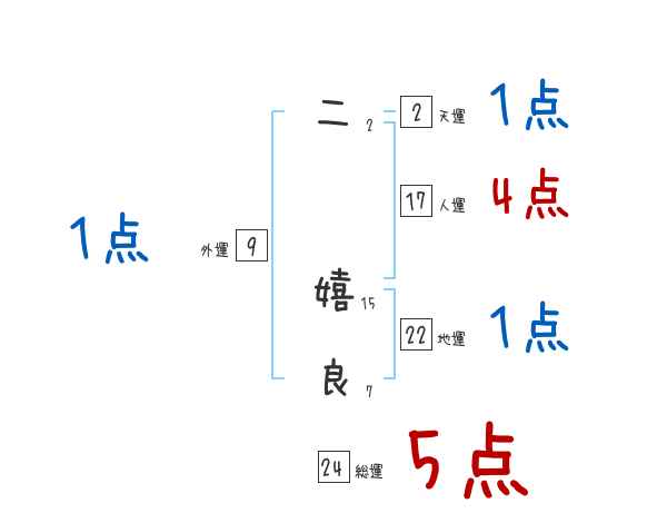 外運![]() | 二嬉良さんの外運は9画の1つ星!消極的で才能を発揮することが苦手なことも。周りの意見に耳を傾けましょう。 生活面を象徴する運勢です。外部から受ける影響力を表し、結婚運、家庭運や職場、環境への順応性を表します。 |