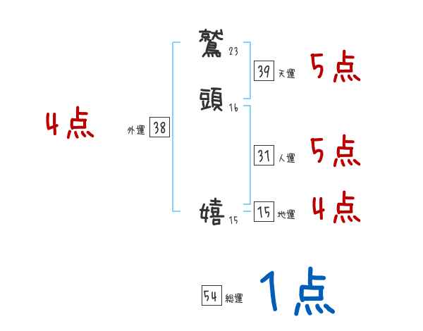 天運![]() | 鷲頭嬉さんの天運は39画の5つ星!社交性に優れ人望が厚い。人の上に立ち成功する。 家系が持つ宿命的な運勢を表します。祖先から受け継いだ苗字ですので自分の力が及びません。家柄を象徴します。 |