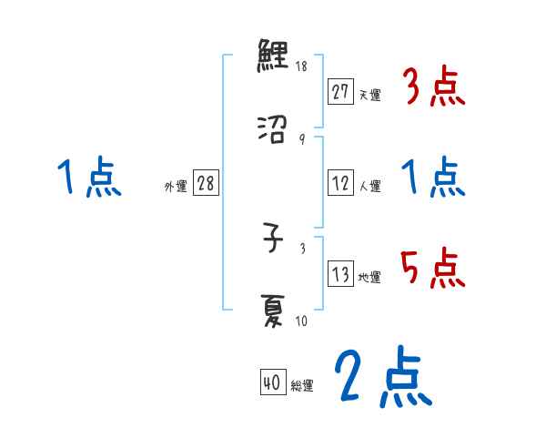 天運![]() | 鯉沼子夏さんの天運は27画の3つ星!頭脳明晰だが強情で摩擦が多い傾向。孤立に注意。 家系が持つ宿命的な運勢を表します。祖先から受け継いだ苗字ですので自分の力が及びません。家柄を象徴します。 |