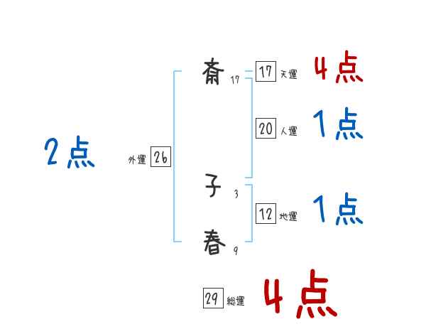 天運![]() | 斎子春さんの天運は17画の4つ星!積極的な行動力。地位を気づき財産を手に入れる。純粋な心と直感力。 家系が持つ宿命的な運勢を表します。祖先から受け継いだ苗字ですので自分の力が及びません。家柄を象徴します。 |