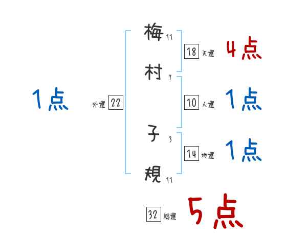 天運![]() | 梅村子規さんの天運は18画の4つ星!情熱的で剛気。忍耐力があり信頼される。 家系が持つ宿命的な運勢を表します。祖先から受け継いだ苗字ですので自分の力が及びません。家柄を象徴します。 |