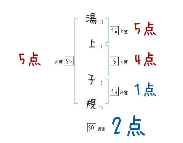 外運![]() | 湯上子規さんの外運は24画の5つ星!家庭運が良く順調な人生。金運にも恵まれる。 生活面を象徴する運勢です。外部から受ける影響力を表し、結婚運、家庭運や職場、環境への順応性を表します。 |