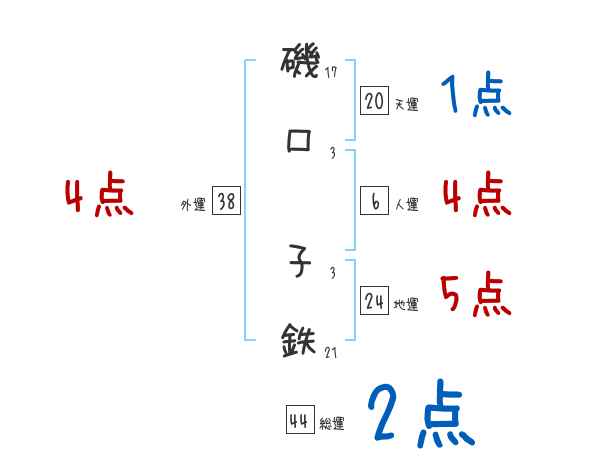 総運![]() | 磯口子鉄さんの総運は44画の2つ星!誠実で慎重な性格。物事を考えすぎないように注意しましょう。 あなたの人生を表す1番重要な運勢です。生涯を通じて影響する総合運となり、主に50歳以降の晩年期に影響を及ぼします。 |
