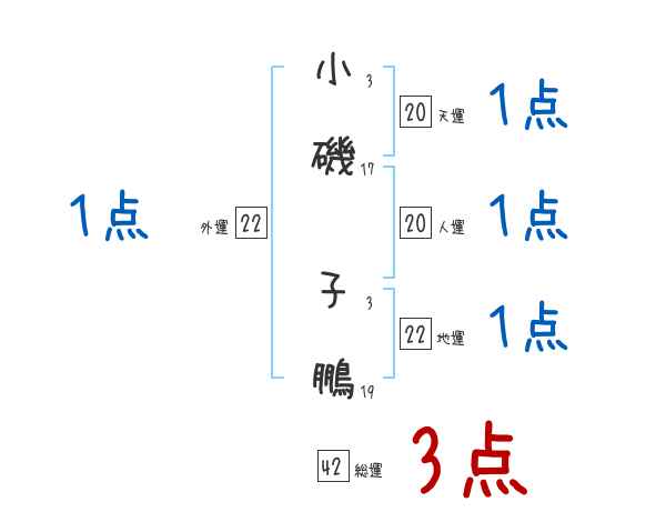 外運![]() | 小磯子鵬さんの外運は22画の1つ星!努力することが苦手ないっぽう手先が器用。芸術性にも優れる。 生活面を象徴する運勢です。外部から受ける影響力を表し、結婚運、家庭運や職場、環境への順応性を表します。 |
