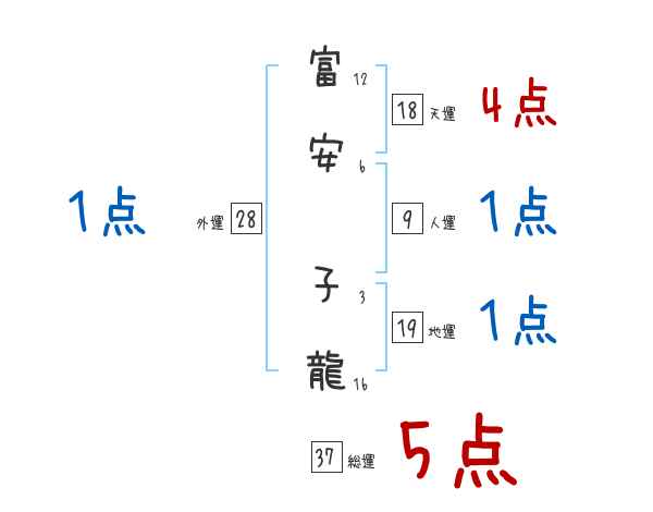 天運![]() | 富安子龍さんの天運は18画の4つ星!情熱的で剛気。忍耐力があり信頼される。 家系が持つ宿命的な運勢を表します。祖先から受け継いだ苗字ですので自分の力が及びません。家柄を象徴します。 |