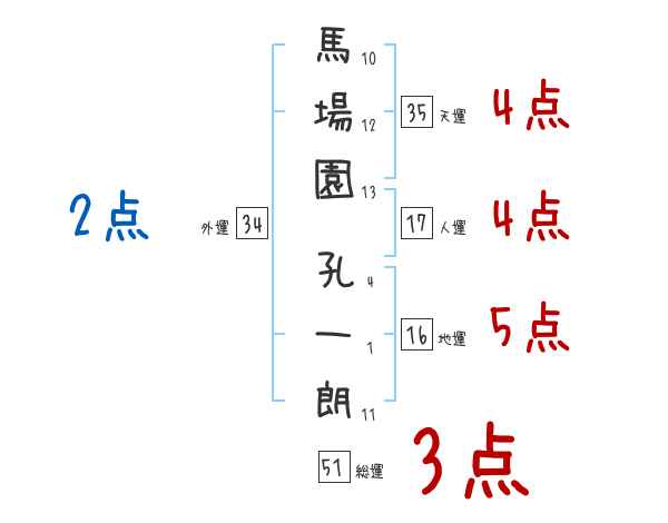 天運![]() | 馬場園孔一朗さんの天運は35画の4つ星!温厚な性格で感受性が高い。穏和な性格で人望が厚い。 家系が持つ宿命的な運勢を表します。祖先から受け継いだ苗字ですので自分の力が及びません。家柄を象徴します。 |