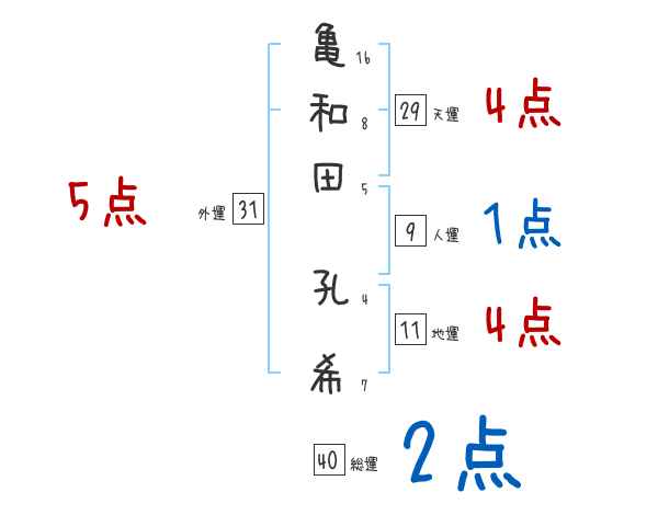 天運![]() | 亀和田孔希さんの天運は29画の4つ星!完全主義で才能がある。厳格な心の持ち主。 家系が持つ宿命的な運勢を表します。祖先から受け継いだ苗字ですので自分の力が及びません。家柄を象徴します。 |