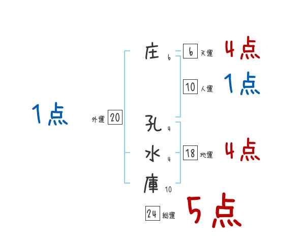 天運![]() | 庄孔水庫さんの天運は6画の4つ星!慎重な努力家で信頼を得る。誠実な精神で向上心に優れる。 家系が持つ宿命的な運勢を表します。祖先から受け継いだ苗字ですので自分の力が及びません。家柄を象徴します。 |