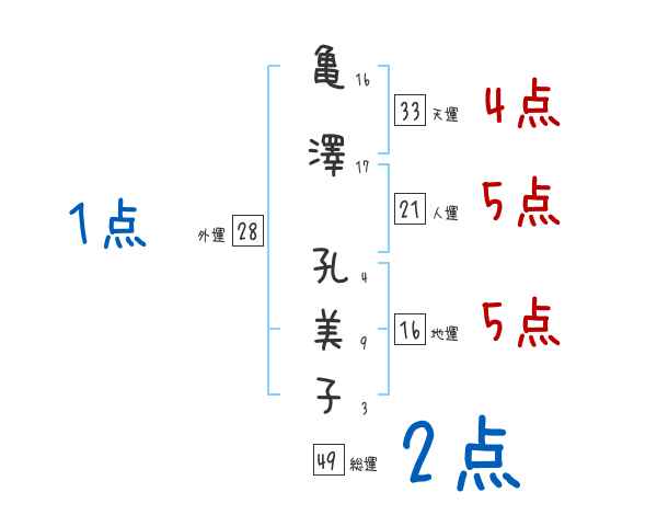 天運![]() | 亀澤孔美子さんの天運は33画の4つ星!権力志向でプライドが高い。勇気があり運を切り開き成功する。 家系が持つ宿命的な運勢を表します。祖先から受け継いだ苗字ですので自分の力が及びません。家柄を象徴します。 |