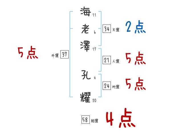 外運![]() | 海老澤孔耀さんの外運は37画の5つ星!努力家で順応性に優れる。現実的な考え方ができ忠実に物事をこなす。 生活面を象徴する運勢です。外部から受ける影響力を表し、結婚運、家庭運や職場、環境への順応性を表します。 |