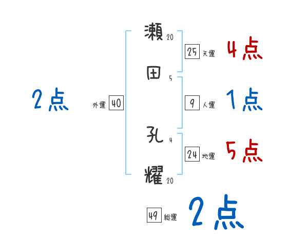 天運![]() | 瀬田孔耀さんの天運は25画の4つ星!個性があり才能があふれる。強運の持ち主で発展する。 家系が持つ宿命的な運勢を表します。祖先から受け継いだ苗字ですので自分の力が及びません。家柄を象徴します。 |