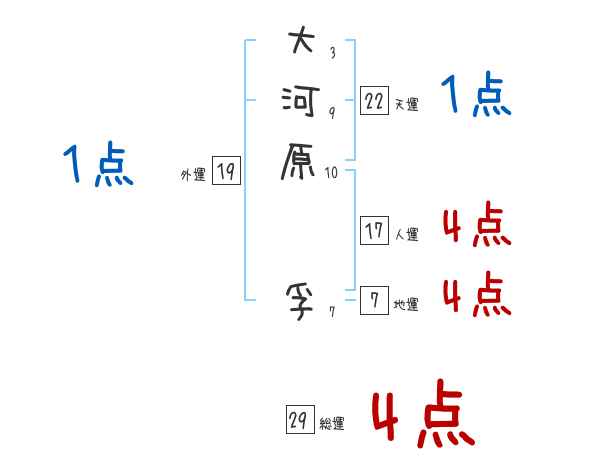 天運![]() | 大河原孚さんの天運は22画の1つ星!努力することが苦手ないっぽう手先が器用。芸術性にも優れる。 家系が持つ宿命的な運勢を表します。祖先から受け継いだ苗字ですので自分の力が及びません。家柄を象徴します。 |