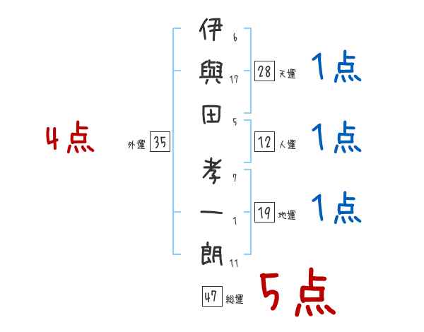 外運![]() | 伊與田孝一朗さんの外運は35画の4つ星!温厚な性格で感受性が高い。穏和な性格で人望が厚い。 生活面を象徴する運勢です。外部から受ける影響力を表し、結婚運、家庭運や職場、環境への順応性を表します。 |