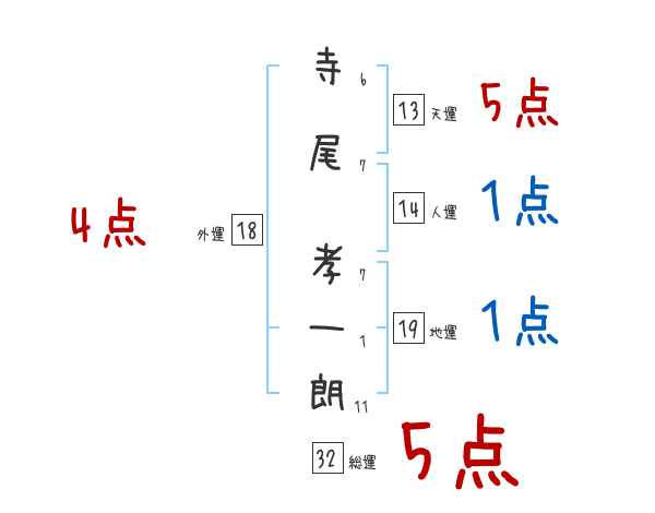 総運![]() | 寺尾孝一朗さんの総運は32画の5つ星!柔軟性があり成功する。チャンスが多く金運が良い。 あなたの人生を表す1番重要な運勢です。生涯を通じて影響する総合運となり、主に50歳以降の晩年期に影響を及ぼします。 |