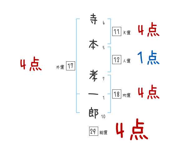 外運![]() | 寺本孝一郎さんの外運は17画の4つ星!積極的な行動力。地位を気づき財産を手に入れる。純粋な心と直感力。 生活面を象徴する運勢です。外部から受ける影響力を表し、結婚運、家庭運や職場、環境への順応性を表します。 |