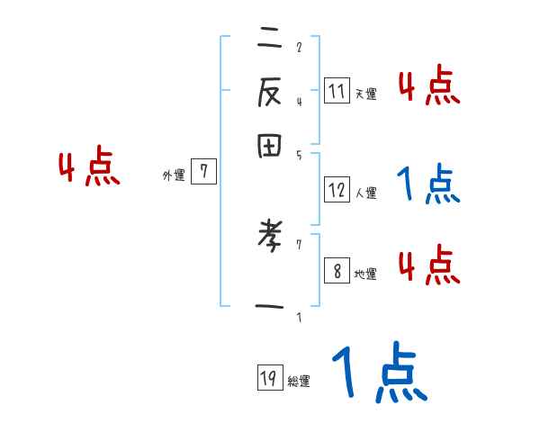 天運![]() | 二反田孝一さんの天運は11画の4つ星!着実に富や地位を得る幸運な人生。 家系が持つ宿命的な運勢を表します。祖先から受け継いだ苗字ですので自分の力が及びません。家柄を象徴します。 |