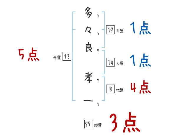 天運![]() | 多々良孝一さんの天運は19画の1つ星!優れた才能を持ちますが、協調性が足りないことも。周りの人と協力する事を意識しましょう。 家系が持つ宿命的な運勢を表します。祖先から受け継いだ苗字ですので自分の力が及びません。家柄を象徴します。 |