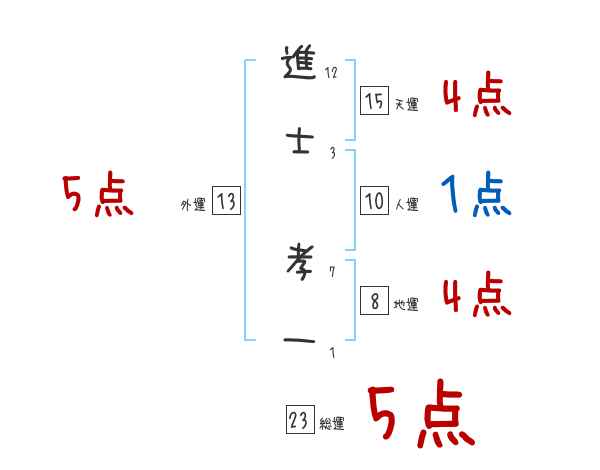 総運![]() | 進士孝一さんの総運は23画の5つ星!想像力に優れ活力がある。一代で成功し名誉を手に入れる。 あなたの人生を表す1番重要な運勢です。生涯を通じて影響する総合運となり、主に50歳以降の晩年期に影響を及ぼします。 |