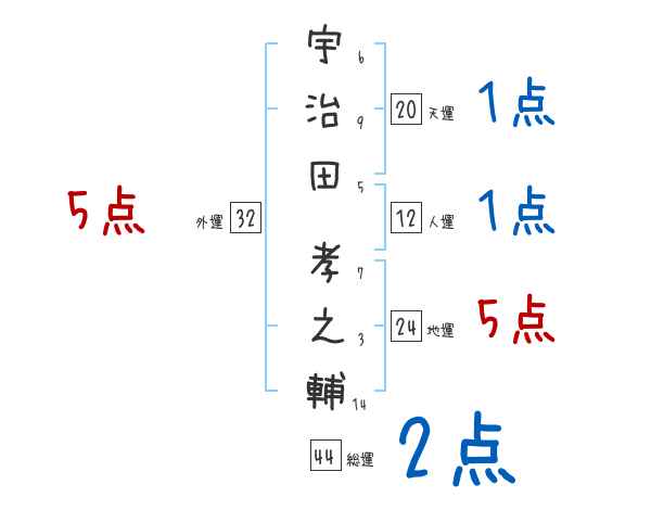 外運![]() | 宇治田孝之輔さんの外運は32画の5つ星!柔軟性があり成功する。チャンスが多く金運が良い。 生活面を象徴する運勢です。外部から受ける影響力を表し、結婚運、家庭運や職場、環境への順応性を表します。 |