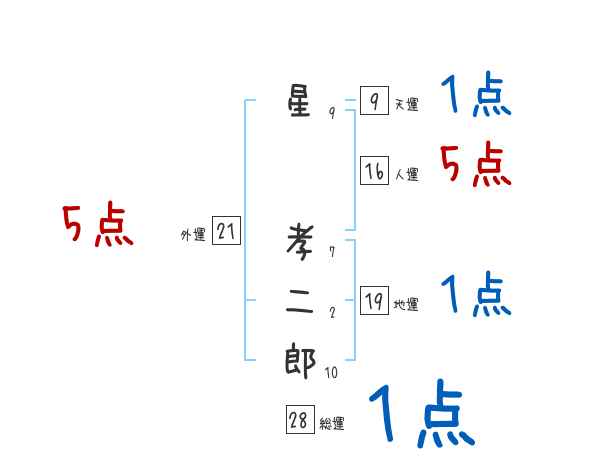 天運![]() | 星孝二郎さんの天運は9画の1つ星!消極的で才能を発揮することが苦手なことも。周りの意見に耳を傾けましょう。 家系が持つ宿命的な運勢を表します。祖先から受け継いだ苗字ですので自分の力が及びません。家柄を象徴します。 |
