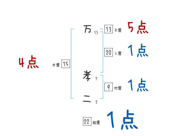 天運![]() | 万孝二さんの天運は13画の5つ星!才能に恵まれ人気がある。名声を手に入れる。円満な人生。 家系が持つ宿命的な運勢を表します。祖先から受け継いだ苗字ですので自分の力が及びません。家柄を象徴します。 |
