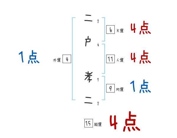 天運![]() | 二戸孝二さんの天運は6画の4つ星!慎重な努力家で信頼を得る。誠実な精神で向上心に優れる。 家系が持つ宿命的な運勢を表します。祖先から受け継いだ苗字ですので自分の力が及びません。家柄を象徴します。 |