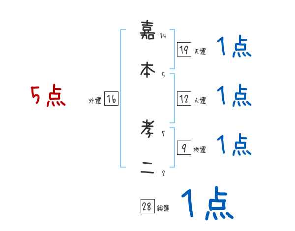外運![]() | 嘉本孝二さんの外運は16画の5つ星!人望が厚く大きく発展する。逆転成功が見える。 生活面を象徴する運勢です。外部から受ける影響力を表し、結婚運、家庭運や職場、環境への順応性を表します。 |