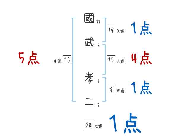 天運![]() | 國武孝二さんの天運は19画の1つ星!優れた才能を持ちますが、協調性が足りないことも。周りの人と協力する事を意識しましょう。 家系が持つ宿命的な運勢を表します。祖先から受け継いだ苗字ですので自分の力が及びません。家柄を象徴します。 |