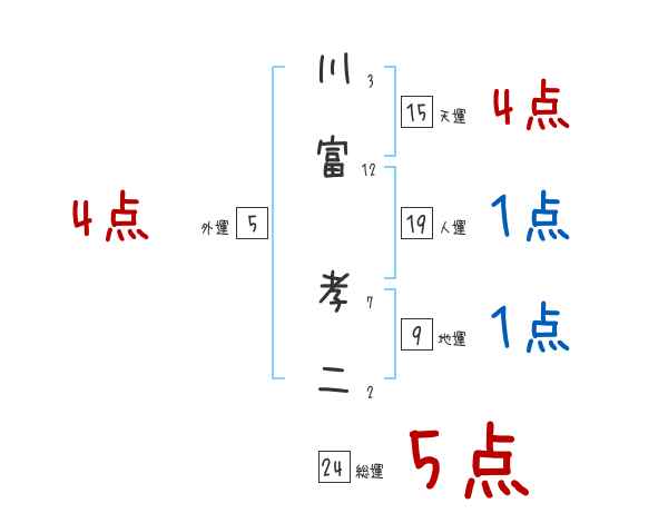 外運![]() | 川富孝二さんの外運は5画の4つ星!健康で安泰。協調性に優れ、財産に恵まれる。 生活面を象徴する運勢です。外部から受ける影響力を表し、結婚運、家庭運や職場、環境への順応性を表します。 |