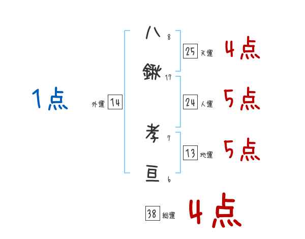 天運![]() | 八鍬孝亘さんの天運は25画の4つ星!個性があり才能があふれる。強運の持ち主で発展する。 家系が持つ宿命的な運勢を表します。祖先から受け継いだ苗字ですので自分の力が及びません。家柄を象徴します。 |