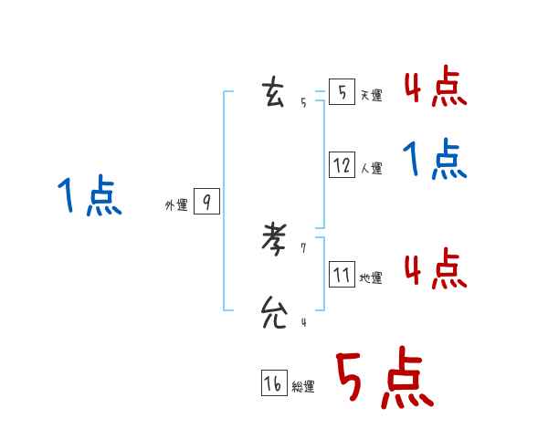天運![]() | 玄孝允さんの天運は5画の4つ星!健康で安泰。協調性に優れ、財産に恵まれる。 家系が持つ宿命的な運勢を表します。祖先から受け継いだ苗字ですので自分の力が及びません。家柄を象徴します。 |
