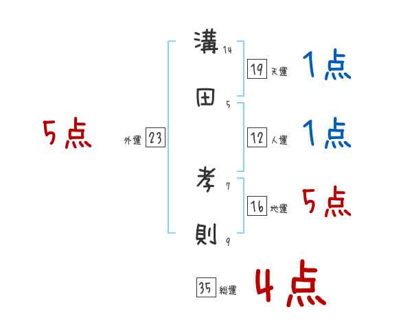 外運![]() | 溝田孝則さんの外運は23画の5つ星!想像力に優れ活力がある。一代で成功し名誉を手に入れる。 生活面を象徴する運勢です。外部から受ける影響力を表し、結婚運、家庭運や職場、環境への順応性を表します。 |