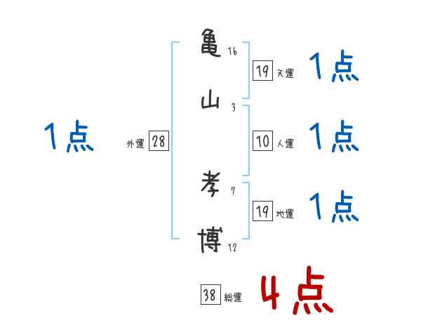外運![]() | 亀山孝博さんの外運は28画の1つ星!家庭環境に注意。スポーツで活躍できる能力があるかも。 生活面を象徴する運勢です。外部から受ける影響力を表し、結婚運、家庭運や職場、環境への順応性を表します。 |