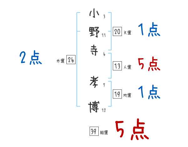 外運![]() | 小野寺孝博さんの外運は26画の2つ星!波瀾万丈かも。信頼できる人を大事にしましょう。 生活面を象徴する運勢です。外部から受ける影響力を表し、結婚運、家庭運や職場、環境への順応性を表します。 |