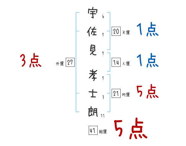 総運![]() | 宇佐見孝士朗さんの総運は41画の5つ星!大志を抱き、目標に向かって実力を発揮し達成する。温和な性格。 あなたの人生を表す1番重要な運勢です。生涯を通じて影響する総合運となり、主に50歳以降の晩年期に影響を及ぼします。 |