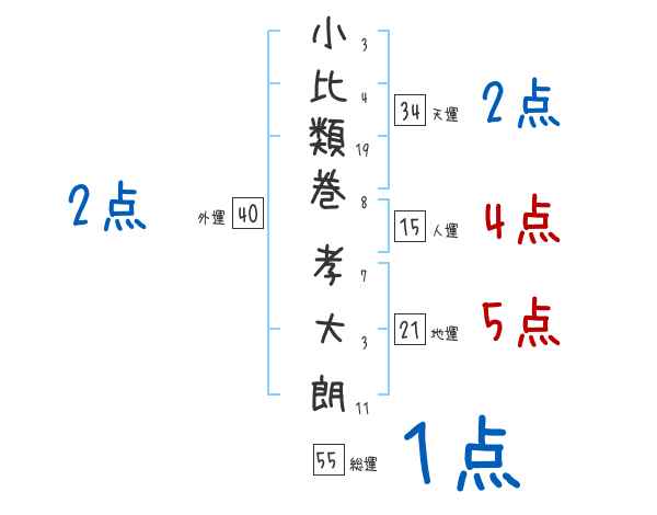 外運![]() | 小比類巻孝大朗さんの外運は40画の2つ星!自信過剰で物事に固執するためトラブルに注意。 生活面を象徴する運勢です。外部から受ける影響力を表し、結婚運、家庭運や職場、環境への順応性を表します。 |