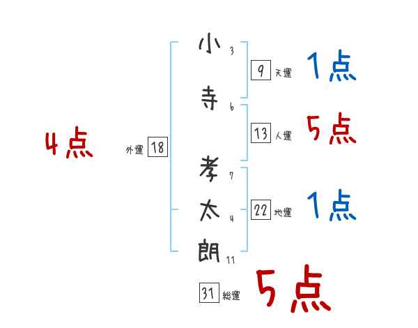外運![]() | 小寺孝太朗さんの外運は18画の4つ星!情熱的で剛気。忍耐力があり信頼される。 生活面を象徴する運勢です。外部から受ける影響力を表し、結婚運、家庭運や職場、環境への順応性を表します。 |