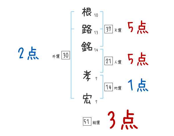 総運![]() | 根路銘孝宏さんの総運は51画の3つ星!変化が激しく、危険に注意。堅実な性格。 あなたの人生を表す1番重要な運勢です。生涯を通じて影響する総合運となり、主に50歳以降の晩年期に影響を及ぼします。 |