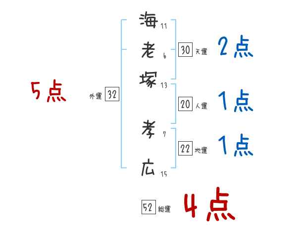 外運![]() | 海老塚孝広さんの外運は32画の5つ星!柔軟性があり成功する。チャンスが多く金運が良い。 生活面を象徴する運勢です。外部から受ける影響力を表し、結婚運、家庭運や職場、環境への順応性を表します。 |