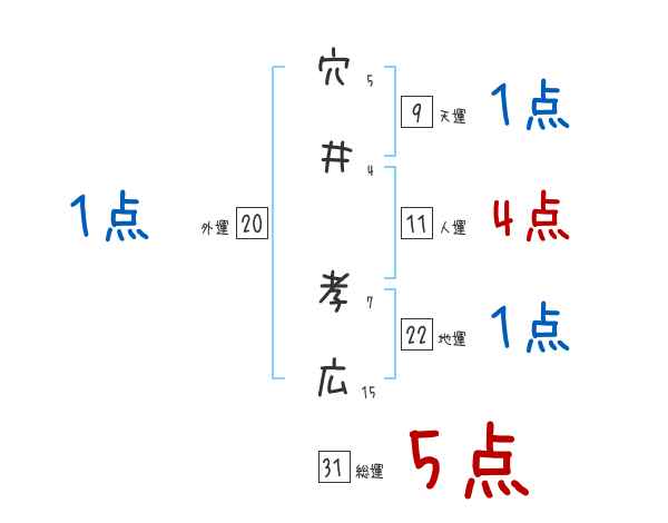 天運![]() | 穴井孝広さんの天運は9画の1つ星!消極的で才能を発揮することが苦手なことも。周りの意見に耳を傾けましょう。 家系が持つ宿命的な運勢を表します。祖先から受け継いだ苗字ですので自分の力が及びません。家柄を象徴します。 |