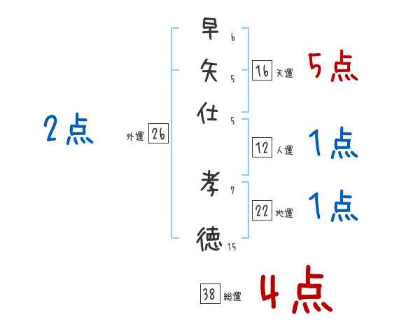 天運![]() | 早矢仕孝徳さんの天運は16画の5つ星!人望が厚く大きく発展する。逆転成功が見える。 家系が持つ宿命的な運勢を表します。祖先から受け継いだ苗字ですので自分の力が及びません。家柄を象徴します。 |